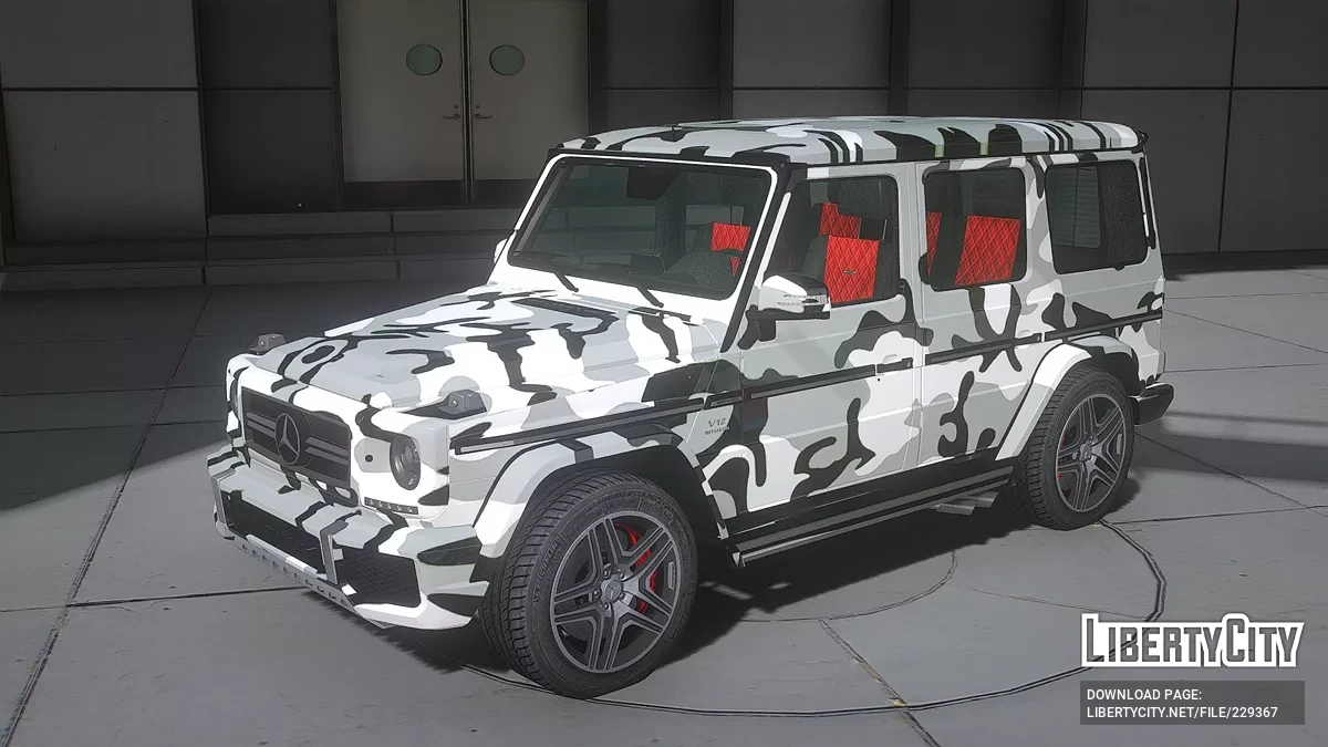 Mercedes-Benz G65 AMG для GTA 5. Передня частина: Капот прикрашений виразним камуфляжним принтом у чорнобілих тонах, що надає позашляховику брутальний і сучасний вигляд. Фірмова решітка радіатора з великою емблемою Mercedes-Benz підкреслює стату...