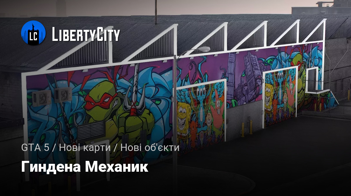Зовнішній вигляд Гіндена Механік являє собою велике промислове будівля з сірою металевою дахом і цегляними стінами. Головна особливість фасаду — яскраве і масштабне графіті, що покриває всю передню стіну. На графіті зображені відомі персонажі поп-культури: Черепашка-ніндзя з червоною пов'язкою, Спанч Боб, Патрик, Кіт з мультфільмів та інші мультяшні герої. Картина виконана в насичених, контрастних кольорах, що робить будівлю дуже помітним і впізнаваним. Контури будівлі і дверей виділені білими світяться лініями, що додає сучасний і стильний акцент. В цілому, зовнішній вигляд майстерні виглядає креативно, молодіжно і привертає увагу завдяки своєму унікальному оформленню.