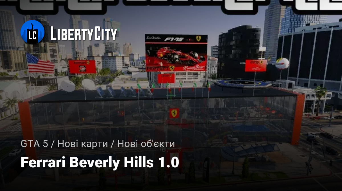 Привіт усім! Радію можливості поділитися з вами своїм новим модом, який додає в гру новий автосалон Ferrari в Беверлі-Хіллз (Рокфорд-Хіллз).