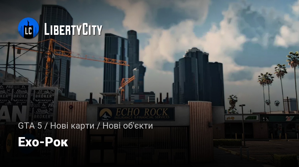 Здание Echo Rock представляет собой одноэтажное строение с фасадом, выполненным из светлого камня или бетона с вертикальными рифлёными элементами. Центральная часть фасада выделяется тёмной вывеской с золотой надписью "ECHO ROCK INSURANCE & FINANCIAL SERVICES" и логотипом в виде горы на фоне солнца. Входная группа состоит из стеклянных дверей и больших окон с металлическими решётками. По обе стороны от входа расположены массивные колонны. Здание выглядит современно и аккуратно, хорошо вписывается в городской пейзаж, на фоне которого виднеются высотные здания и строительные краны. Рядом расположены другие коммерческие помещения и парковка, а также пальмы, придающие месту калифорнийский колорит.