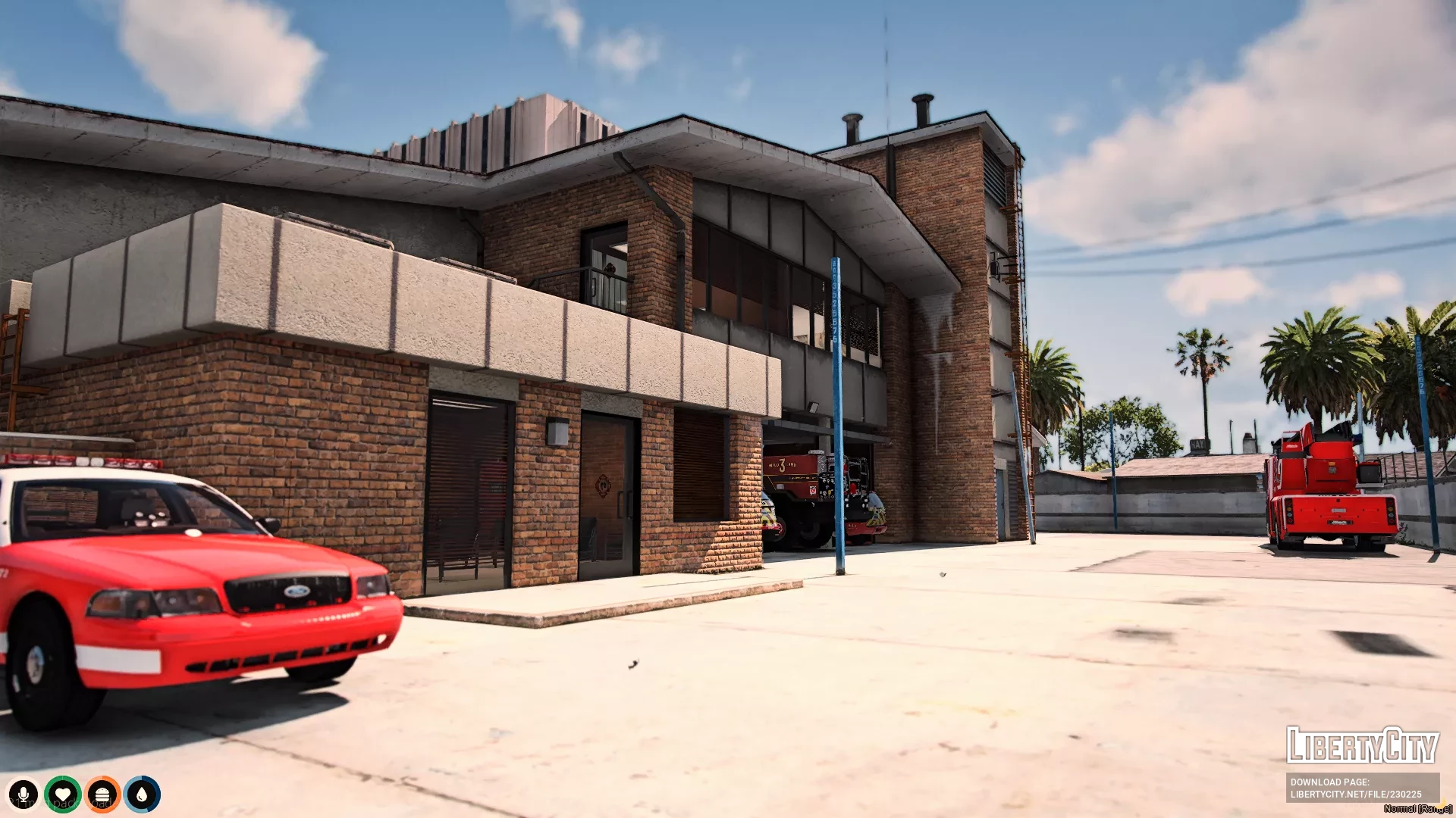 Перед зданием расположена просторная бетонная площадка, на которой припаркованы пожарные машины — две красные и одна ярко-жёлтая, а также красный внедорожник. На фасаде, слева от въезда в гараж, закреплена американская государственная флагшток. Большие панорамные окна на втором этаже обеспечивают хорошее освещение внутренних помещений. Вход в здание находится справа, рядом с каменной частью фасада и большими стеклянными дверями.