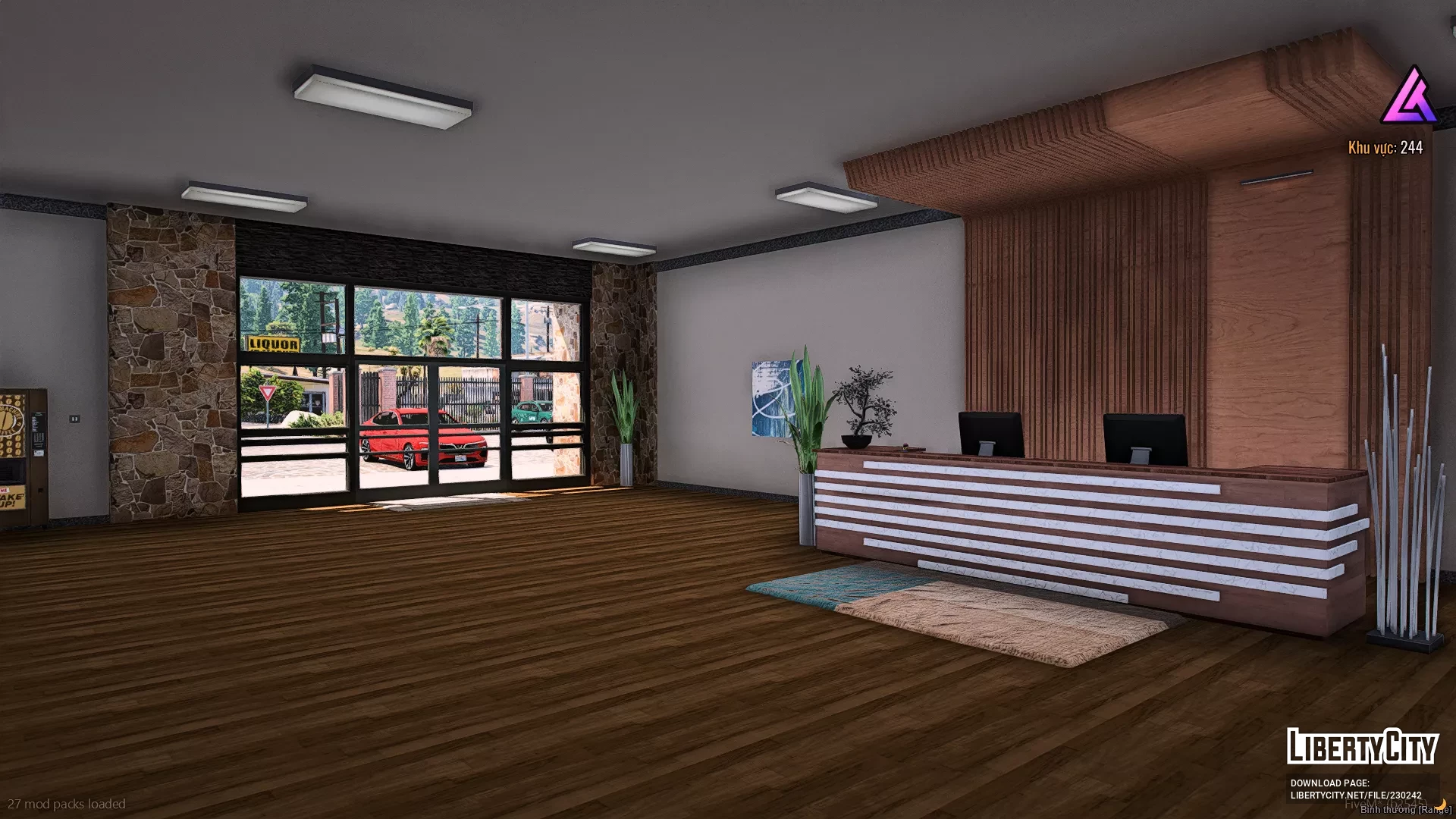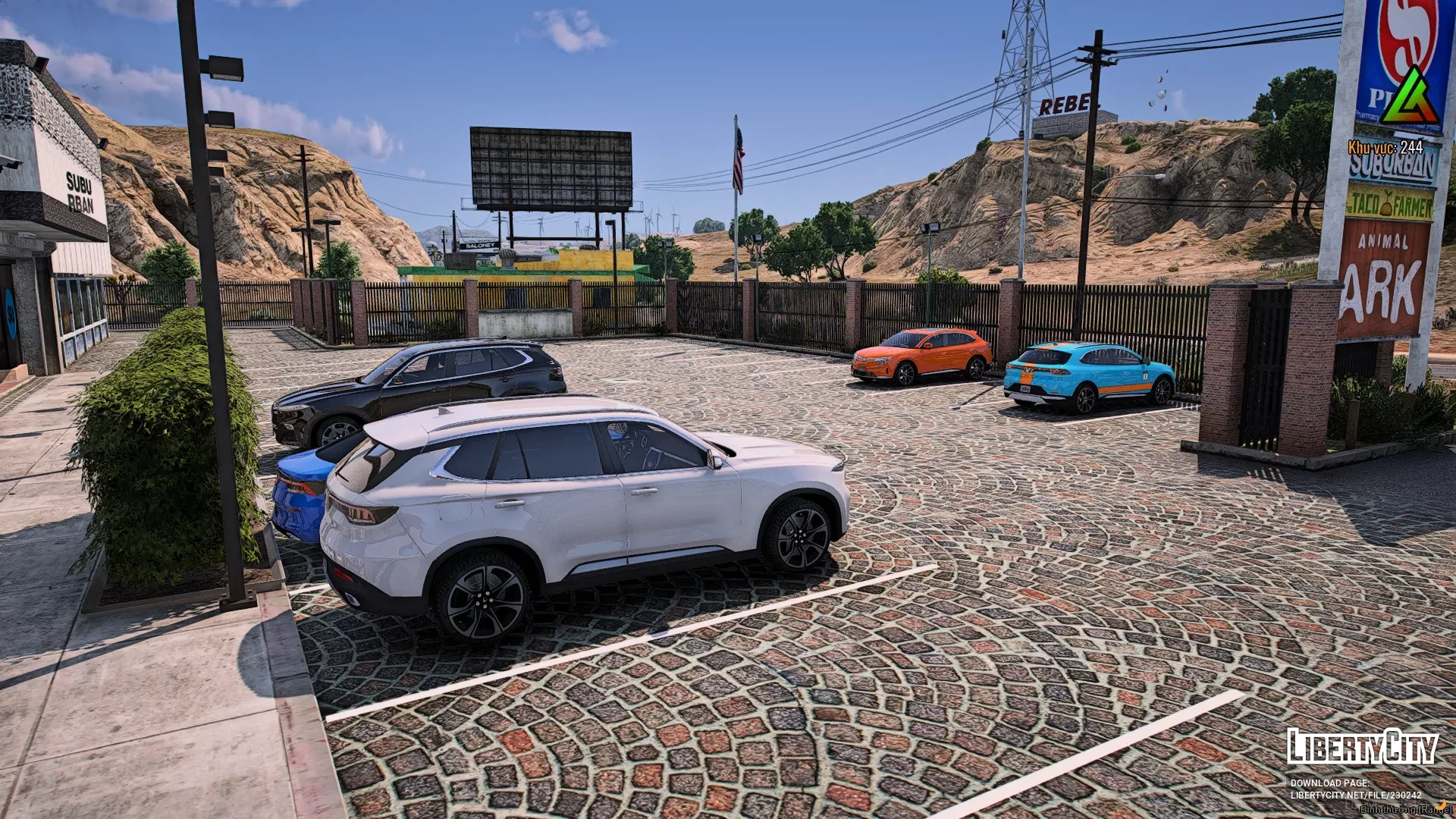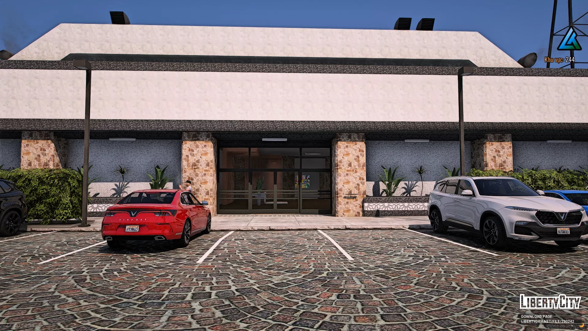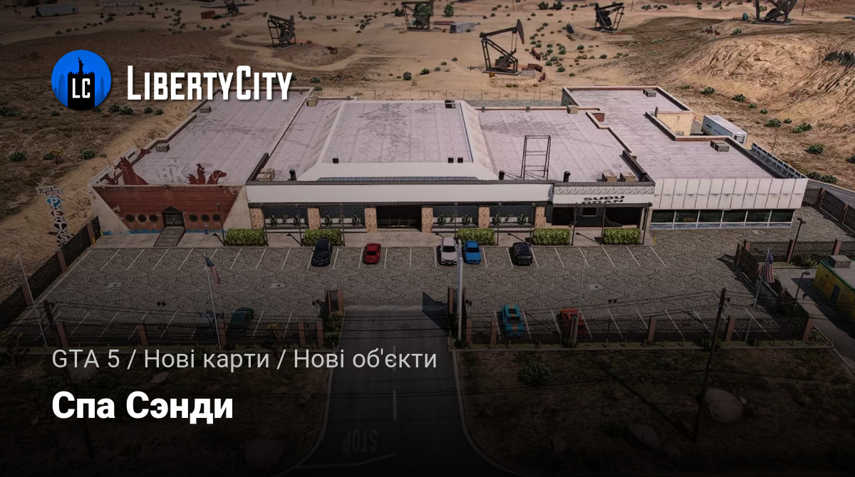 Spa Sandy — это большое одноэтажное здание, выполненное в современном стиле. Фасад здания светлый, с вставками из кирпича и большими стеклянными окнами по всей передней части. Перед входом находится аккуратная парковка с разметкой, где стоят несколько автомобилей. Территория огорожена металлическим забором с воротами на въезде. По периметру участка растут низкие кустарники и небольшие деревья. Слева от здания виден яркий неоновый знак и надпись "Relax". Справа прилегает небольшое отдельное здание, раскрашенное в жёлто-зелёные цвета. Вокруг комплекса располагается пустынная местность с редкой растительностью и холмами, на заднем плане виднеются нефтяные качалки.