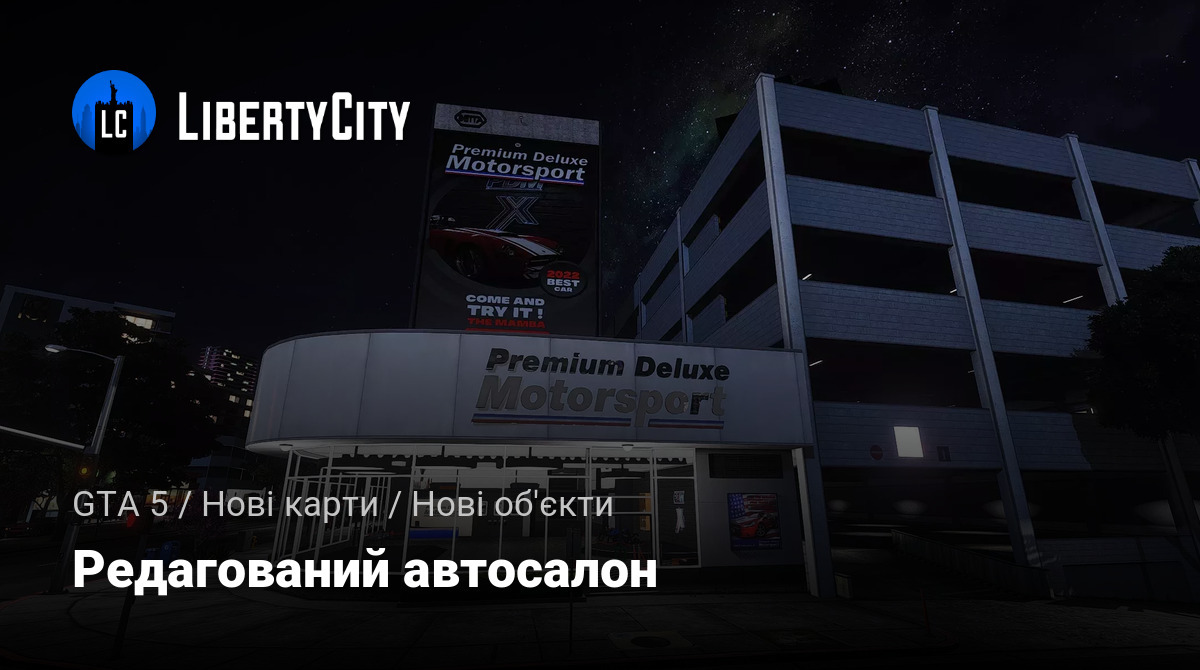 Автосалон розташований на розі жвавої вулиці та вирізняється своїм сучасним виглядом. Фасад будівлі оформлений у світлих тонах з великою вивіскою "Premium Deluxe Motorsport" над входом. Вітринні вікна займають майже всю передню частину будівлі, дозволяючи заглянути всередину та побачити виставкові автомобілі. Над салоном височіє великий рекламний щит з зображенням спортивного автомобіля та написами, що привертають увагу перехожих. Поруч з автосалоном знаходиться багаторівнева парковка, а по периметру будівлі ростуть доглянуті дерева та кущі. У нічний час фасад та навколишня територія добре освітлені вуличними ліхтарями, що надає салону ще більш презентабельного вигляду.