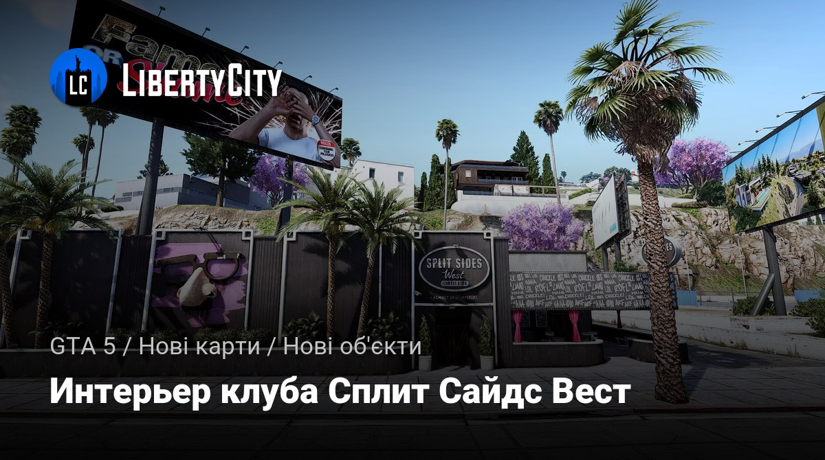 Здание выполнено в современном стиле с элементами минимализма. Фасад окрашен в темные тона, что придаёт клубу стильный и солидный вид. Вход украшен двумя высокими зелёными кустами в белых горшках, а над дверью размещена большая круглая вывеска с надписью "Split Sides West". С обеих сторон от входа растут пальмы и декоративные растения, что добавляет атмосферы Лос-Сантоса.