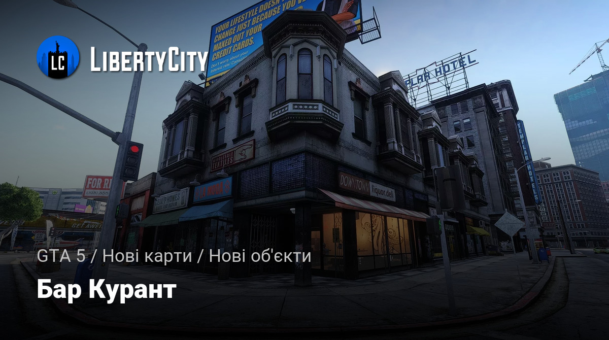 Бар Kurant знаходиться на розі жвавого перехрестя і займає стару двоповерхову будівлю в класичному американському стилі. Фасад будівлі виконаний з темного, трохи зношеного каменю з декоративними елементами та еркерами на другому поверсі. На першому поверсі розташовані великі вітринні вікна, за якими видно інтер'єр бару. Над входом і вікнами розміщені яскраві вивіски та навіси з написами, а сама будівля виглядає трохи потертою, що надає їй атмосферу старого міського закладу. На даху встановлені рекламні щити, один з яких привертає увагу своїм яскравим дизайном. Бар гармонійно вписується в міське середовище, оточений тротуарами, дорожніми знаками та світлофорами, що підкреслює його розташування в центрі великого мегаполісу.