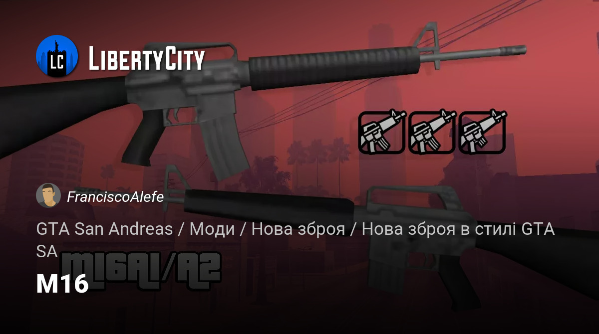 Мод, дружній до сюжету оригінальної гри, M16, вирізаний з GTA San Andreas і знайдений лише у кат-сценах, тепер використовується і в звичайному режимі. Хоча багато людей ставлять текстури зброї з Manhunt 2, цей мод має дещо темнішу та сміливішу текст...