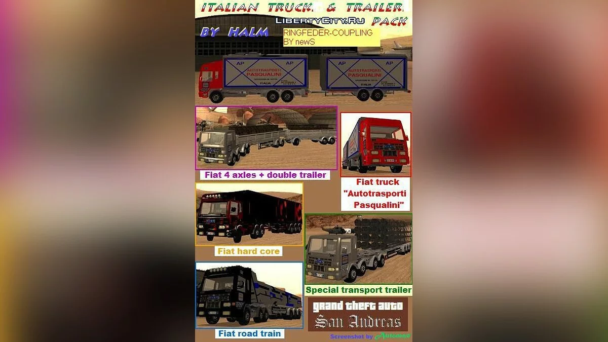 Пакет вантажівок Фердинанд для GTA San Andreas. До всіх моделей у пакеті додані подвійні задні колеса, також виправлені баги стандартних моделей. Додані робочі вогні на всіх трейлерах. Список моделей у пакеті: - Оновлений Янкі. - Оновлений Петров. ...